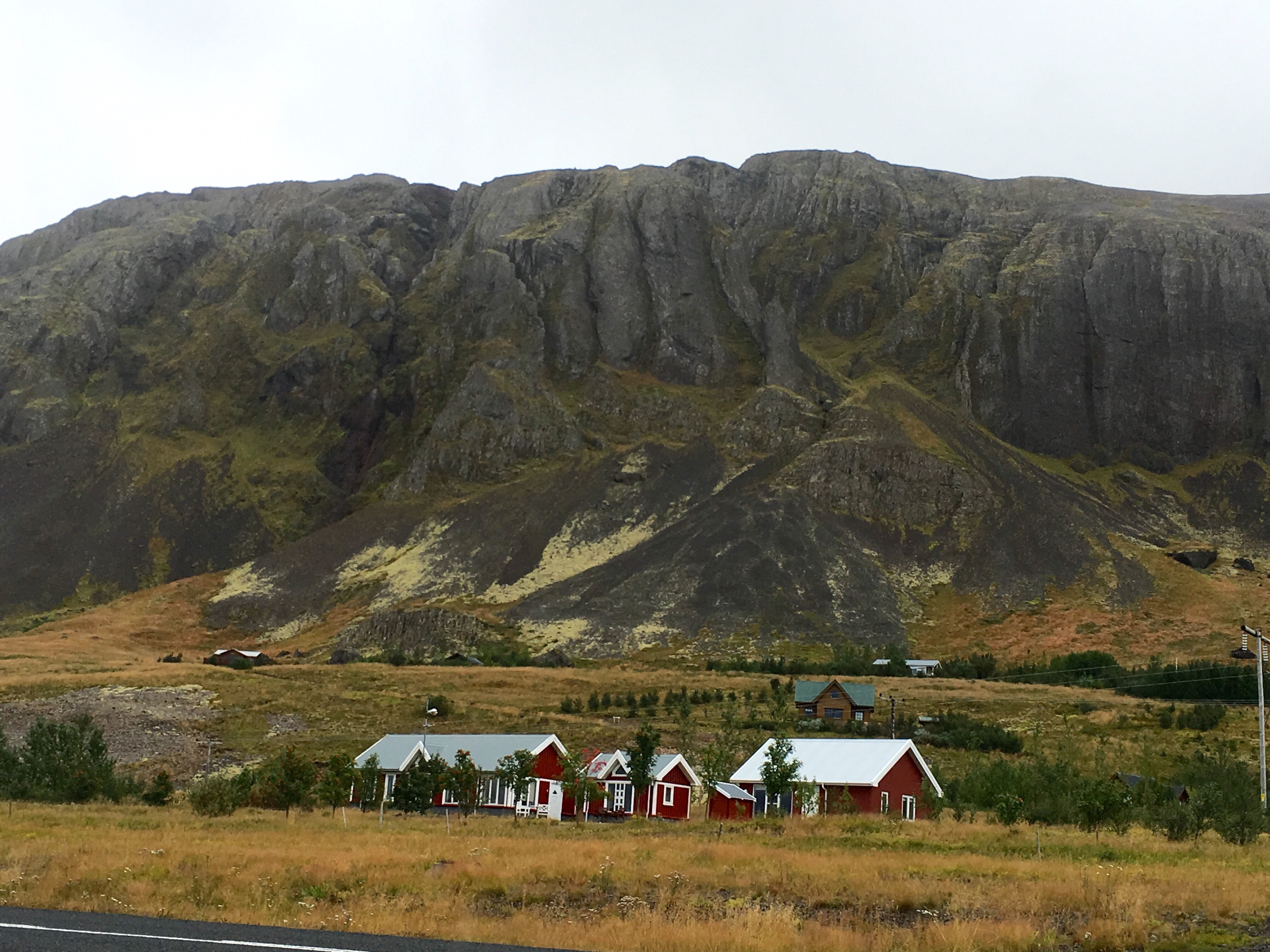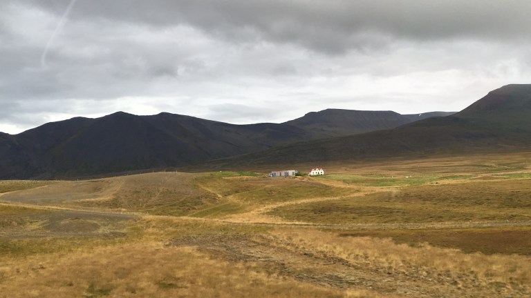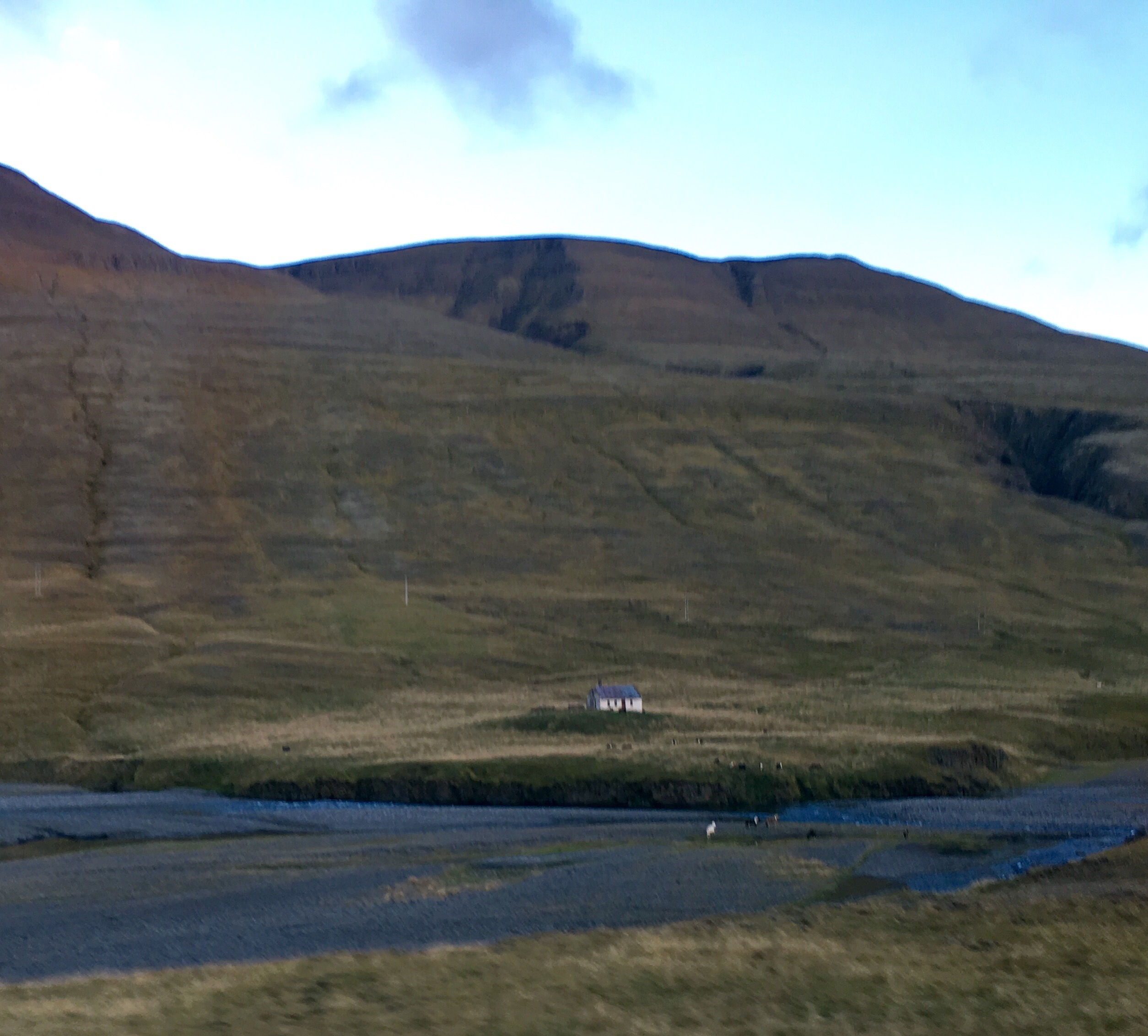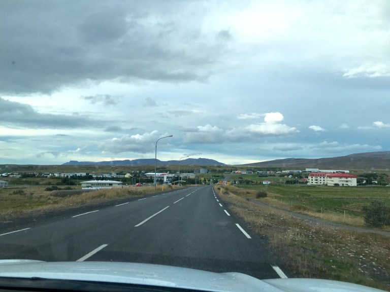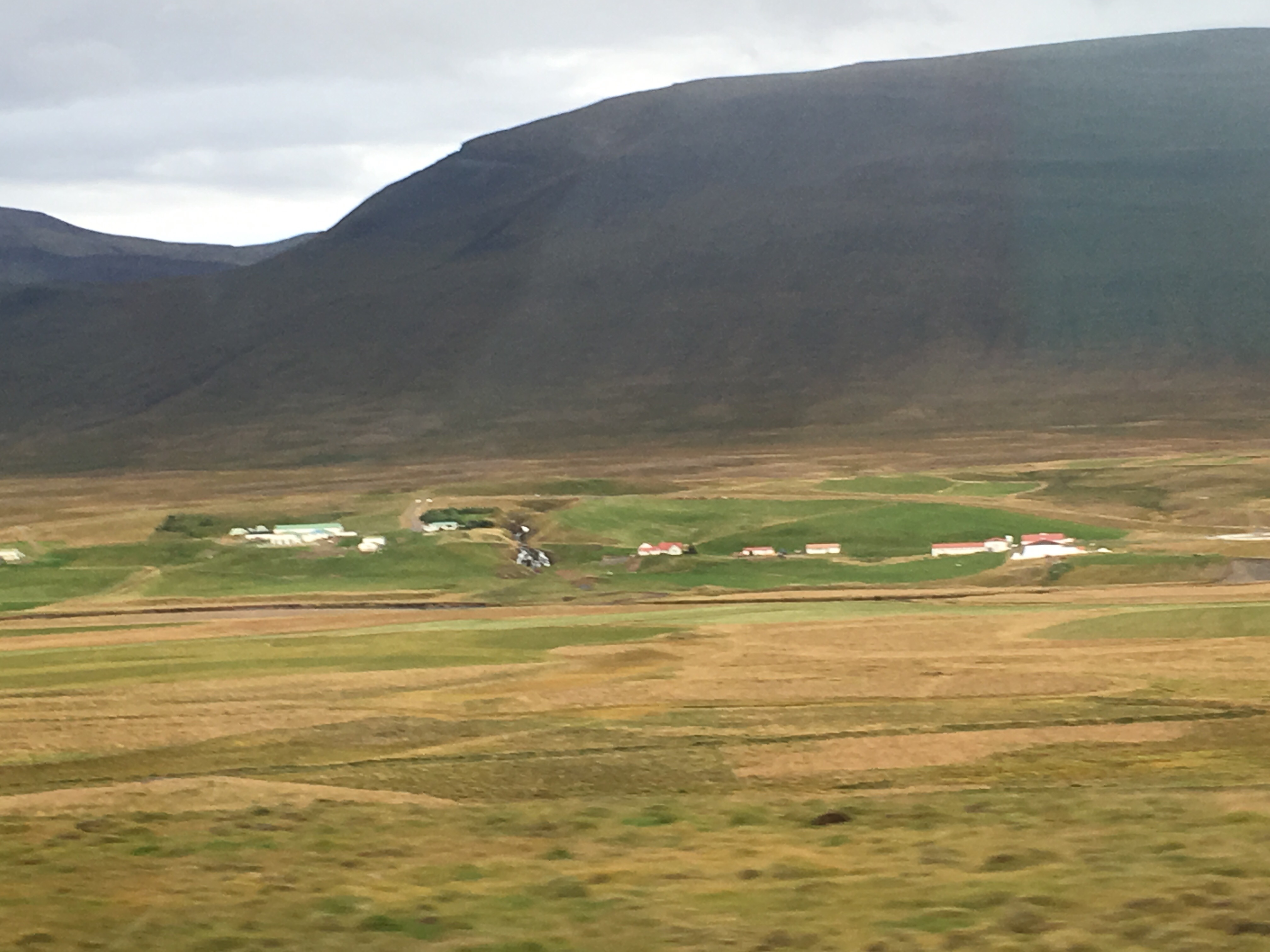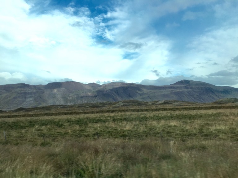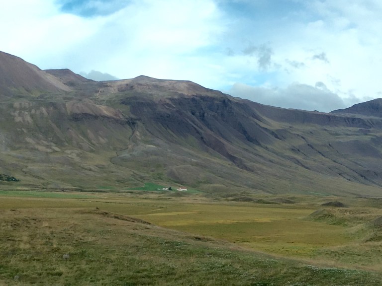 Green undulating hills either side, rifts and shallow waterways and waterfalls. Sheep huddled among the grasses. It’s been raining since Borganes and the area feels very desolate. There are very few dwellings and I imagine because it’s bleak and swept with icy winds in winter because it’s not too inviting now. Nevertheless it is beautiful like the Yorkshire Moors in Jane Eyre.