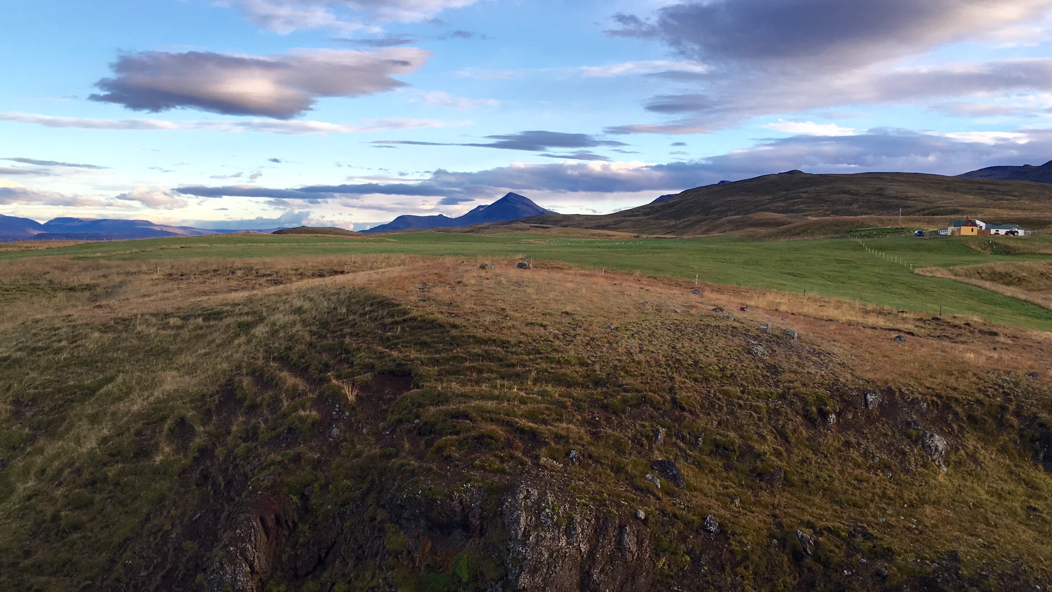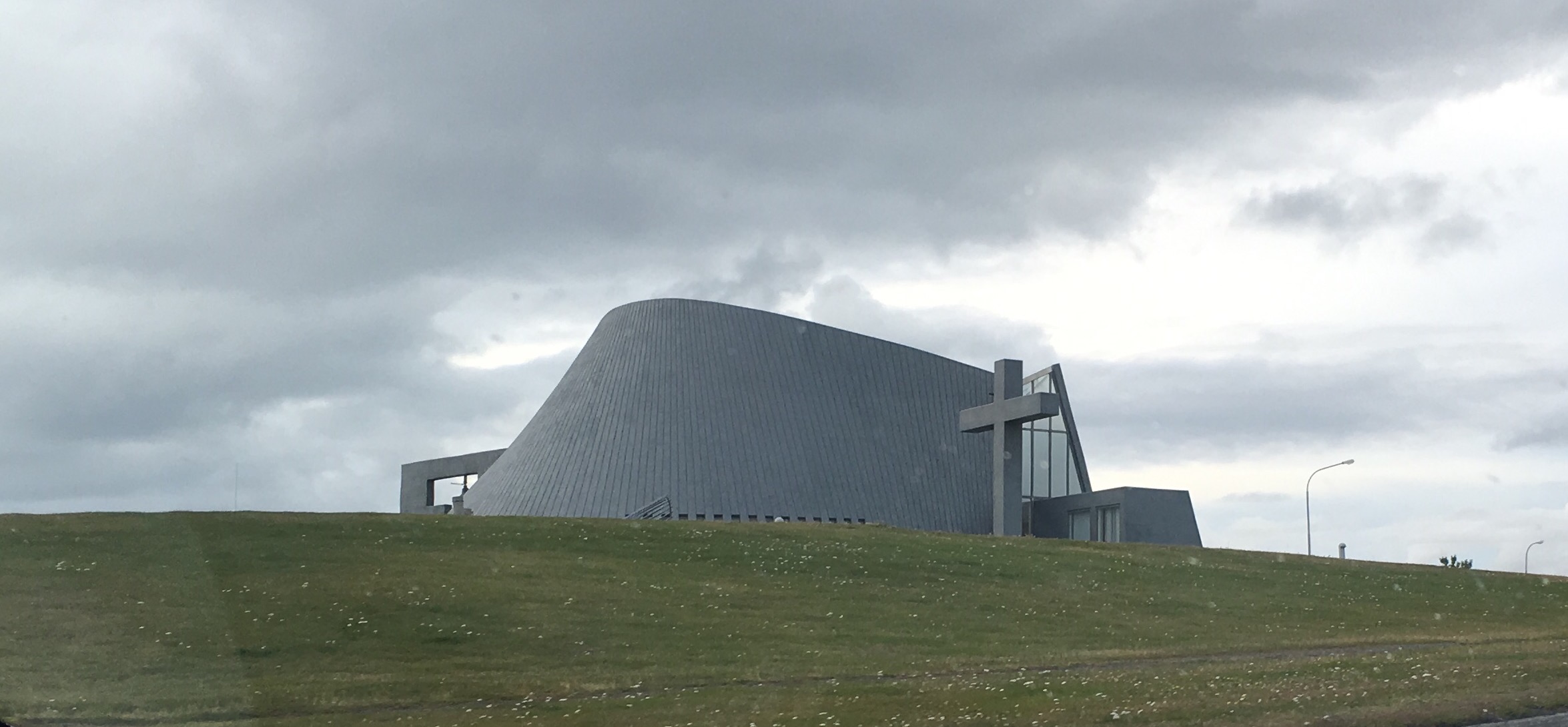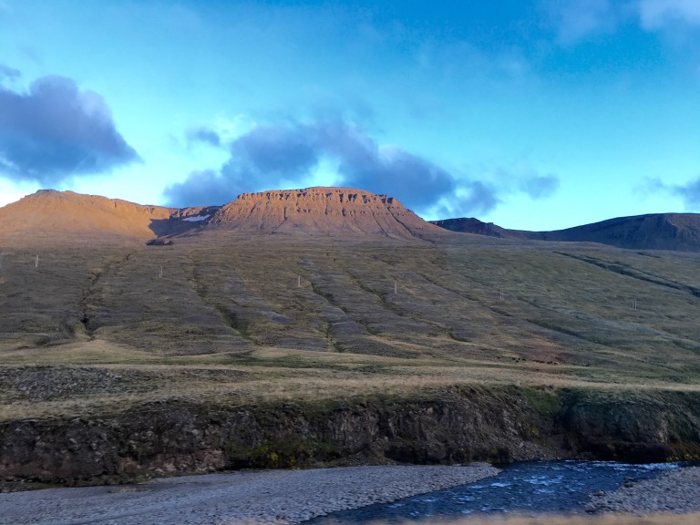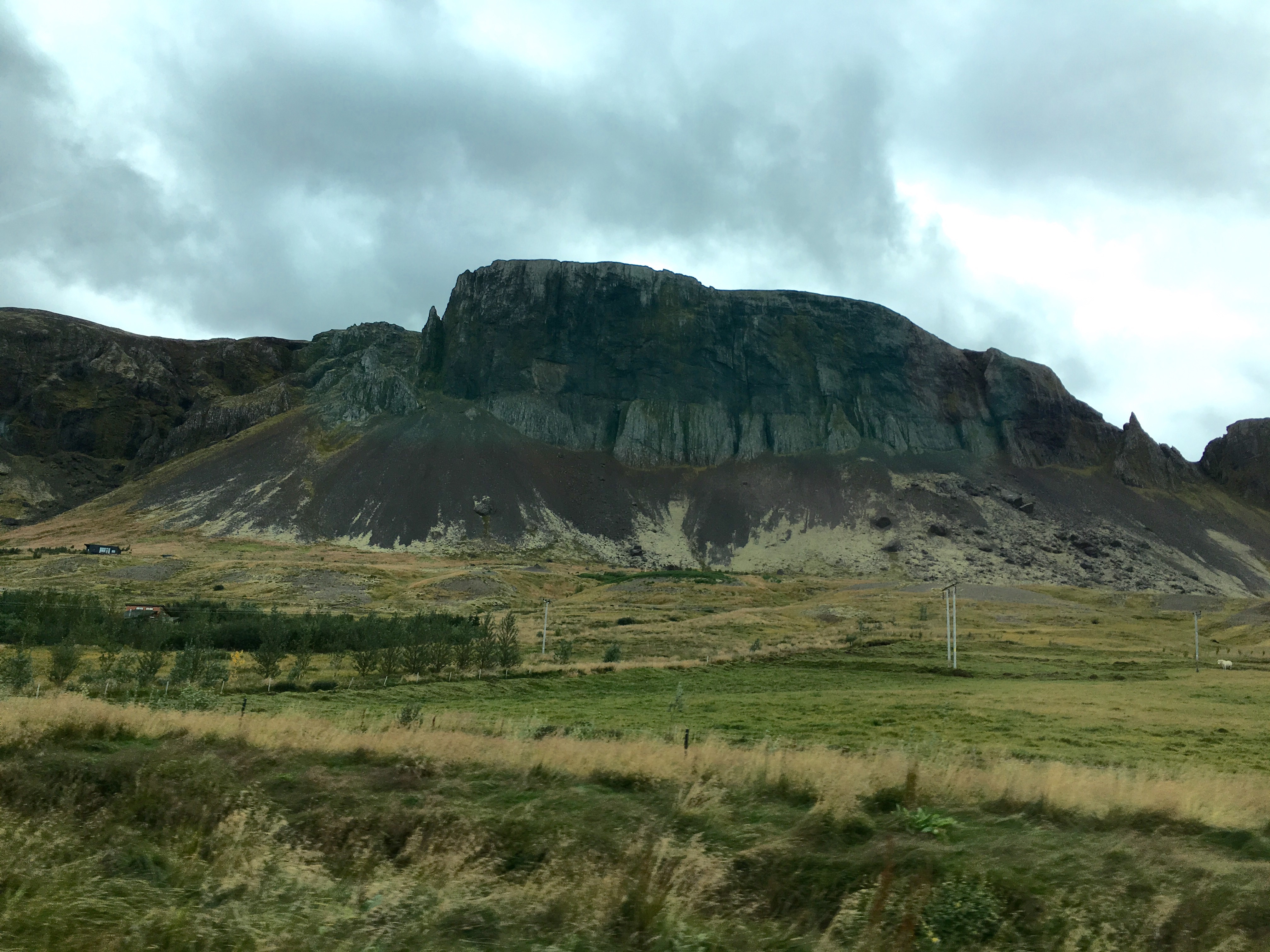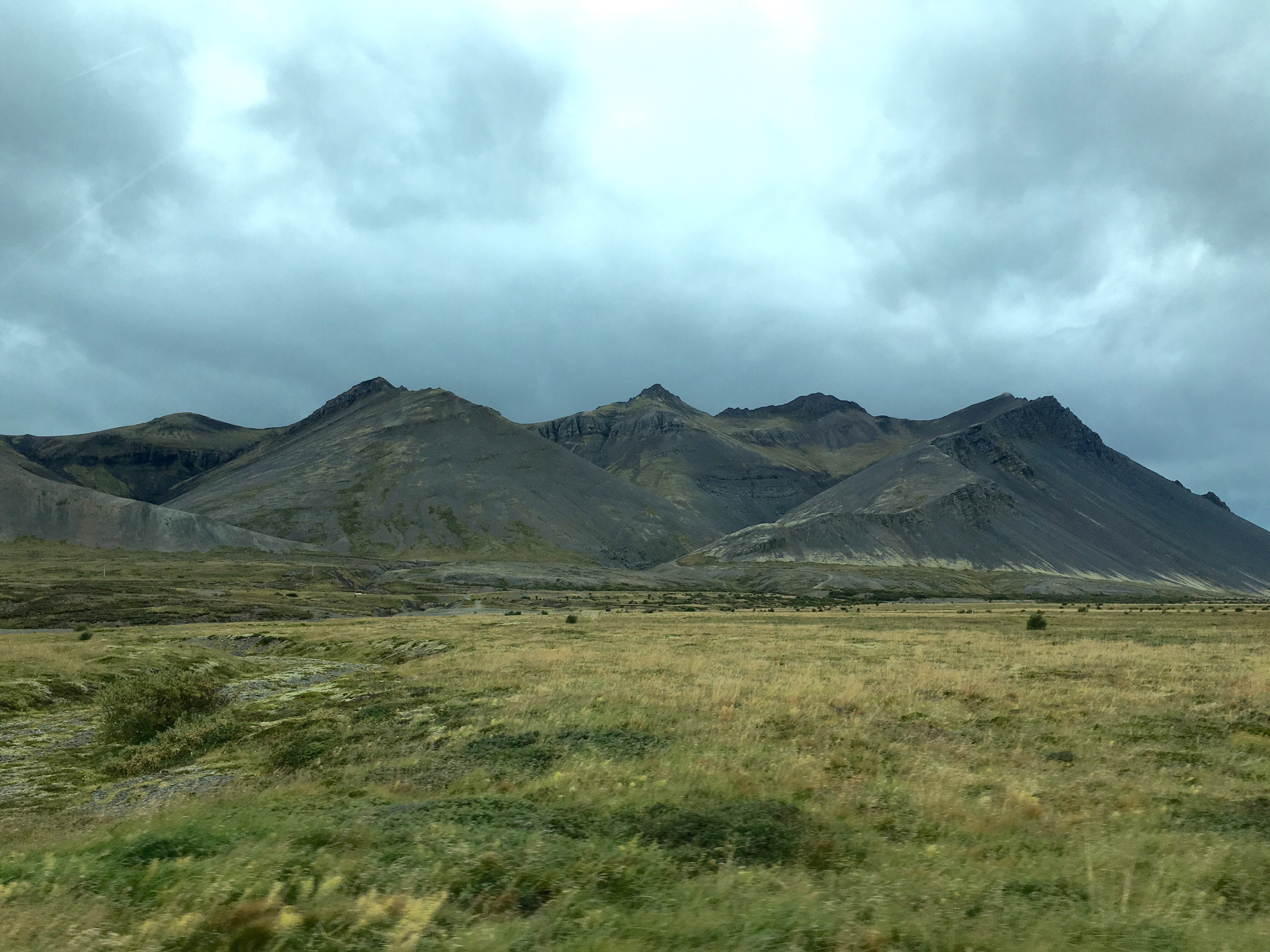 Green undulating hills either side, rifts and shallow waterways and waterfalls. Sheep huddled among the grasses. It’s been raining since Borganes and the area feels very desolate. There are very few dwellings and I imagine because it’s bleak and swept with icy winds in winter because it’s not too inviting now. Nevertheless it is beautiful like the Yorkshire Moors in Jane Eyre.
