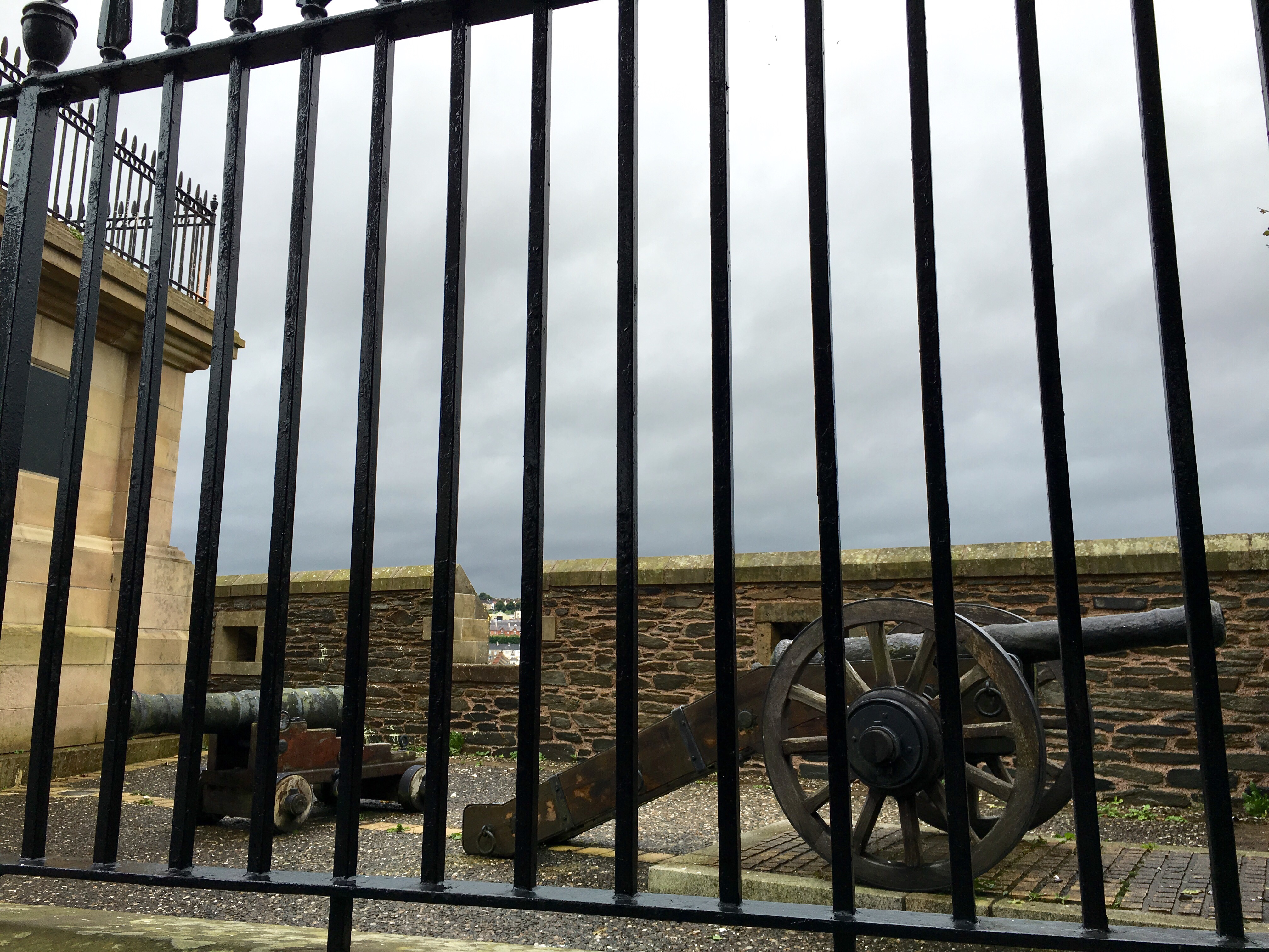 The canons once pointed out to greenfields and now they overlook Bogside and the Guildhall (council chambers).