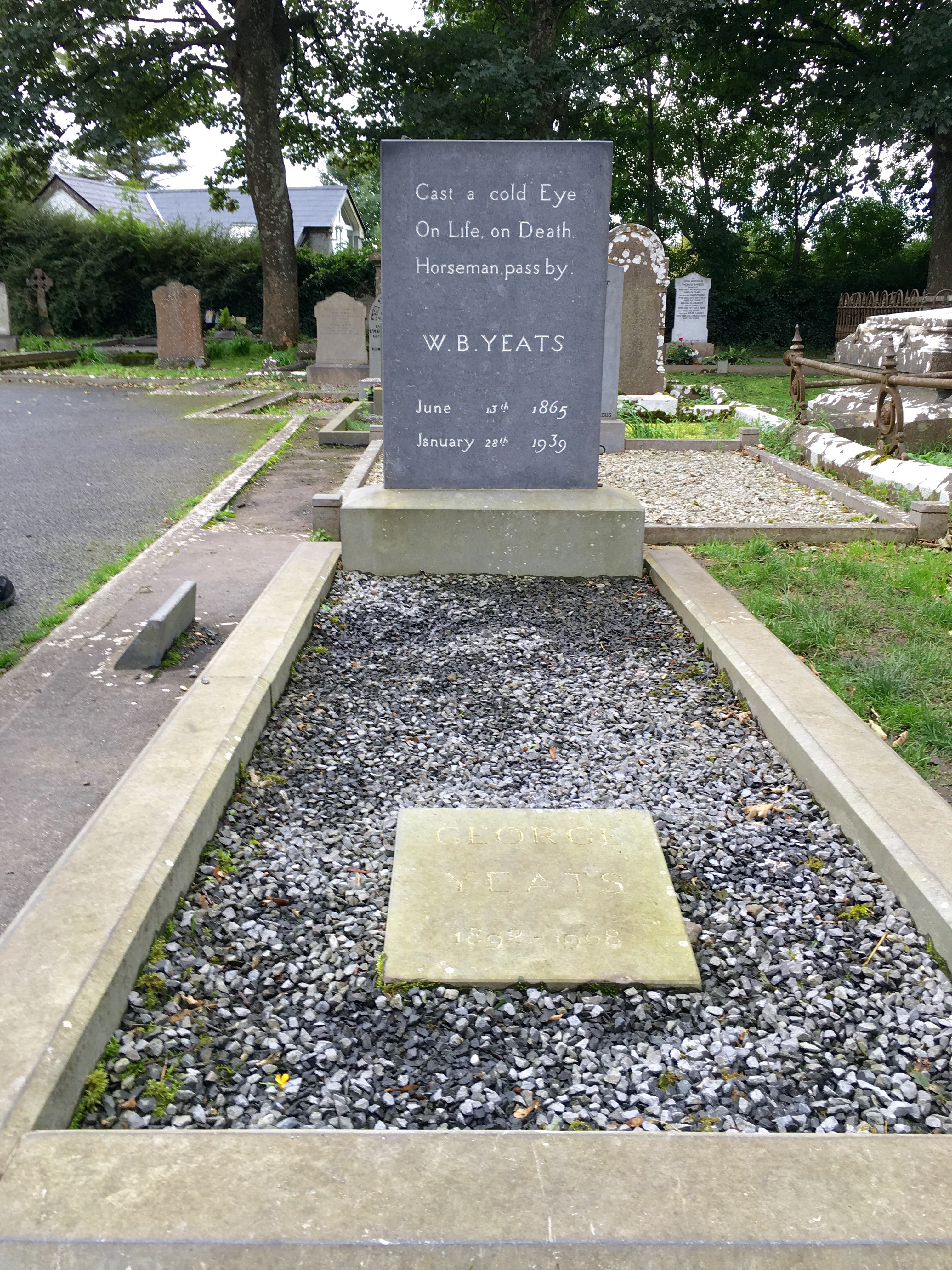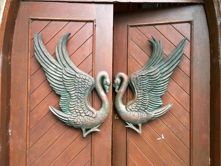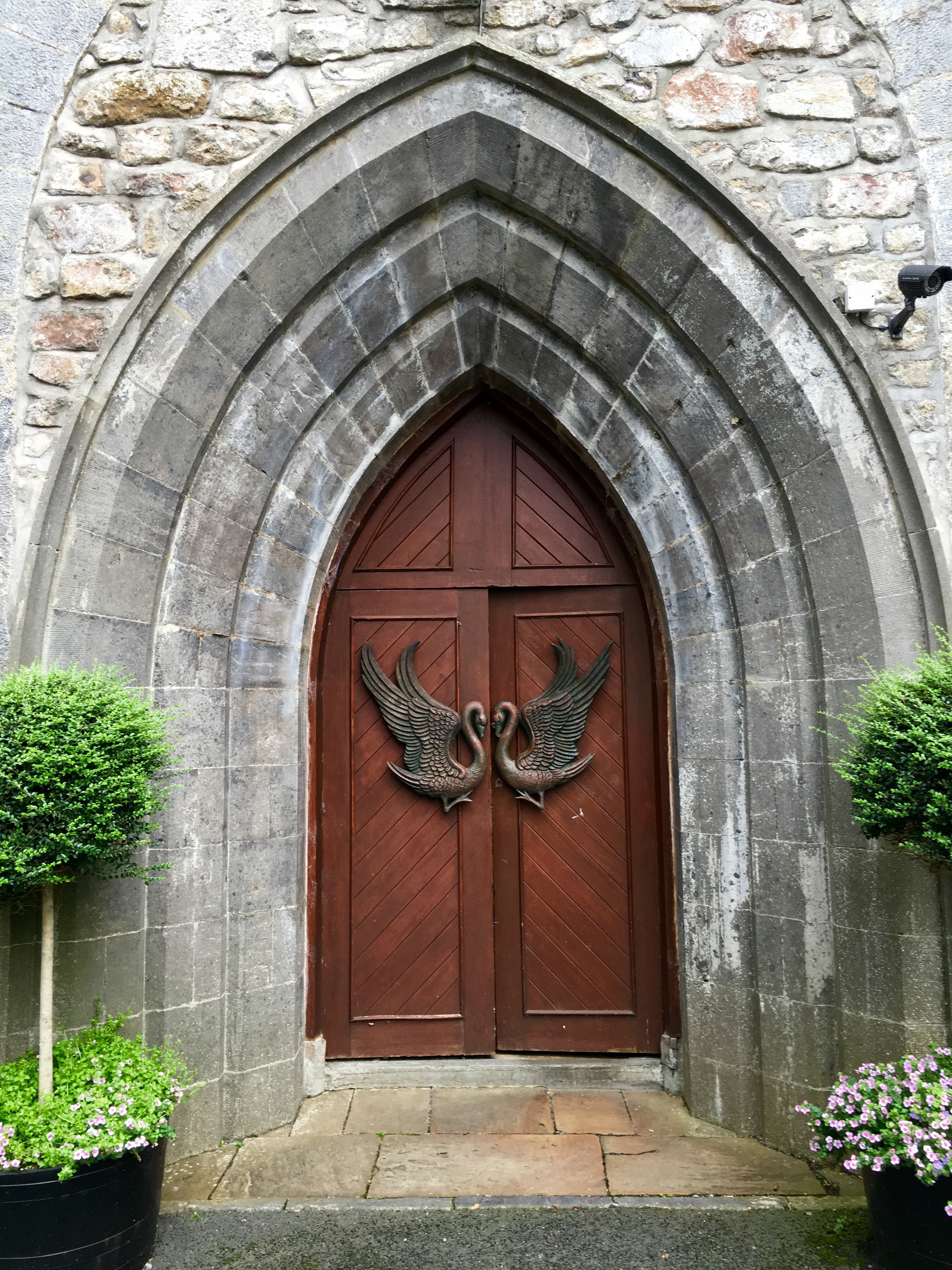 Out next stop was the Drumcliffe Church where WB Yeats is buried. We listened to Easter, 1916 while we journeyed and today’s blog post title comes from that poem. The poem describes Yeat’s torn emotions regarding the events of the Easter Rising staged in Ireland against British rule on Easter Monday, April 24, 1916. The uprising was unsuccessful, and most of the Irish republican leaders involved were executed for treason (they appear on one of the murals in Londonderry Derry). The swans on the door were given by Western Australia.