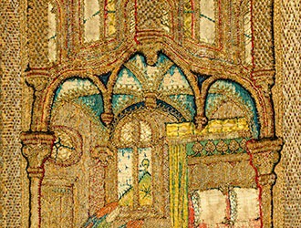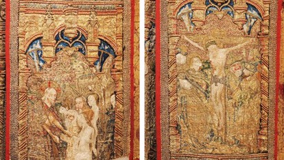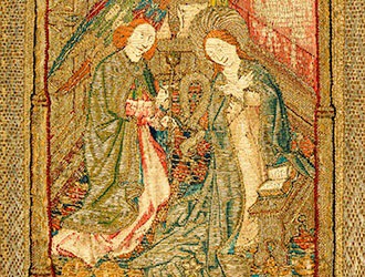 Dating from the 1460s the Waterford cloth-of-gold vestments are made from Italian silk woven in Florence. The panels were embroidered in Bruges which was the centre of the medieval embroidery industry.