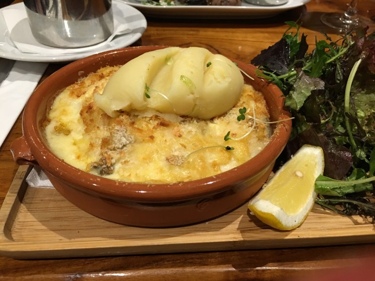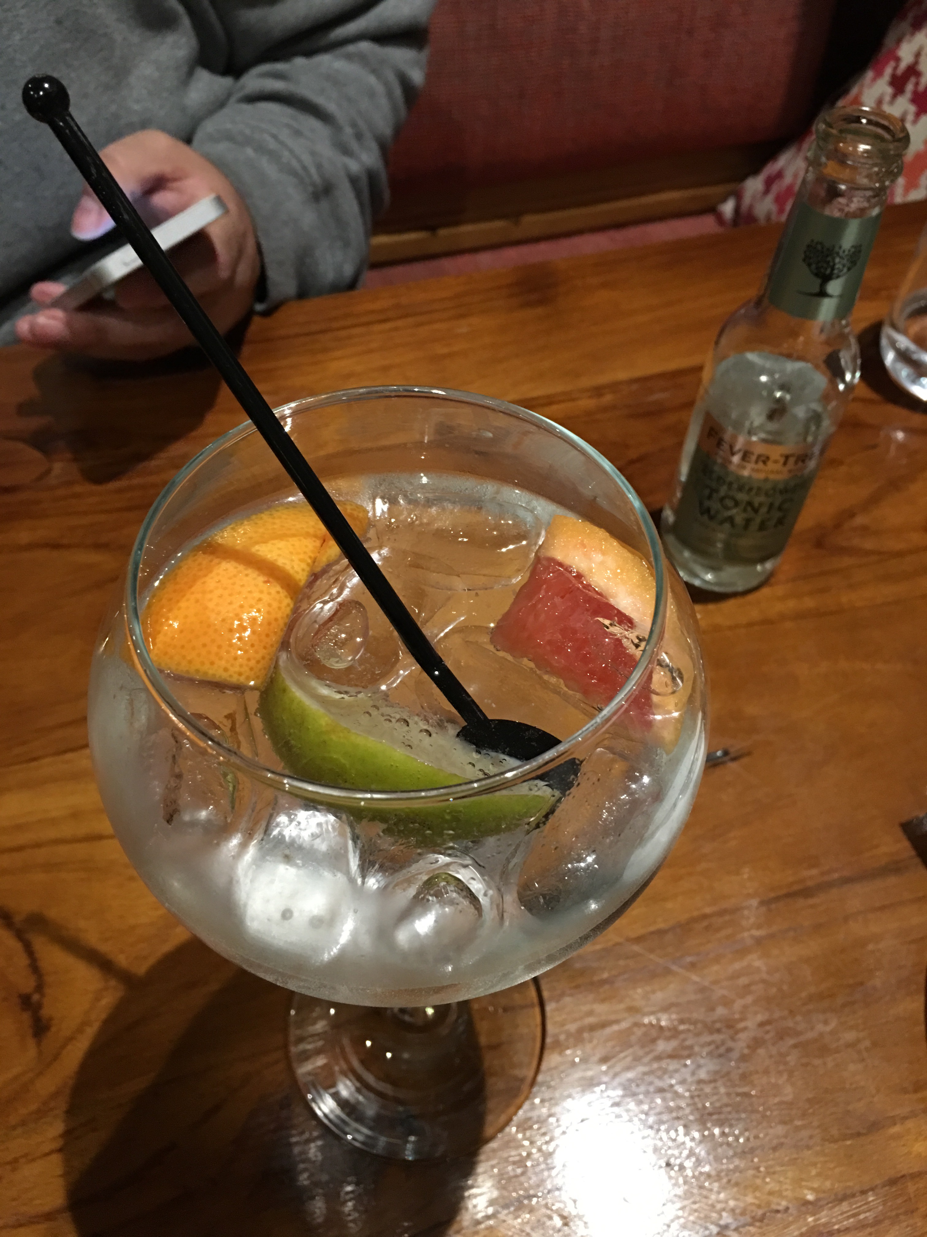 Tonight’s dinner was at Bodéga and was delicious despite the teenager with us listening to unsavory music on his headphones and being unpleasant. I had a smoked haddock and cockle bake with potato. Josh had a steak with little brown onions. Tonight’s gin was a gunpowder strength Irish gin called Drumshambo, with elderflower tonic and grapefruit.