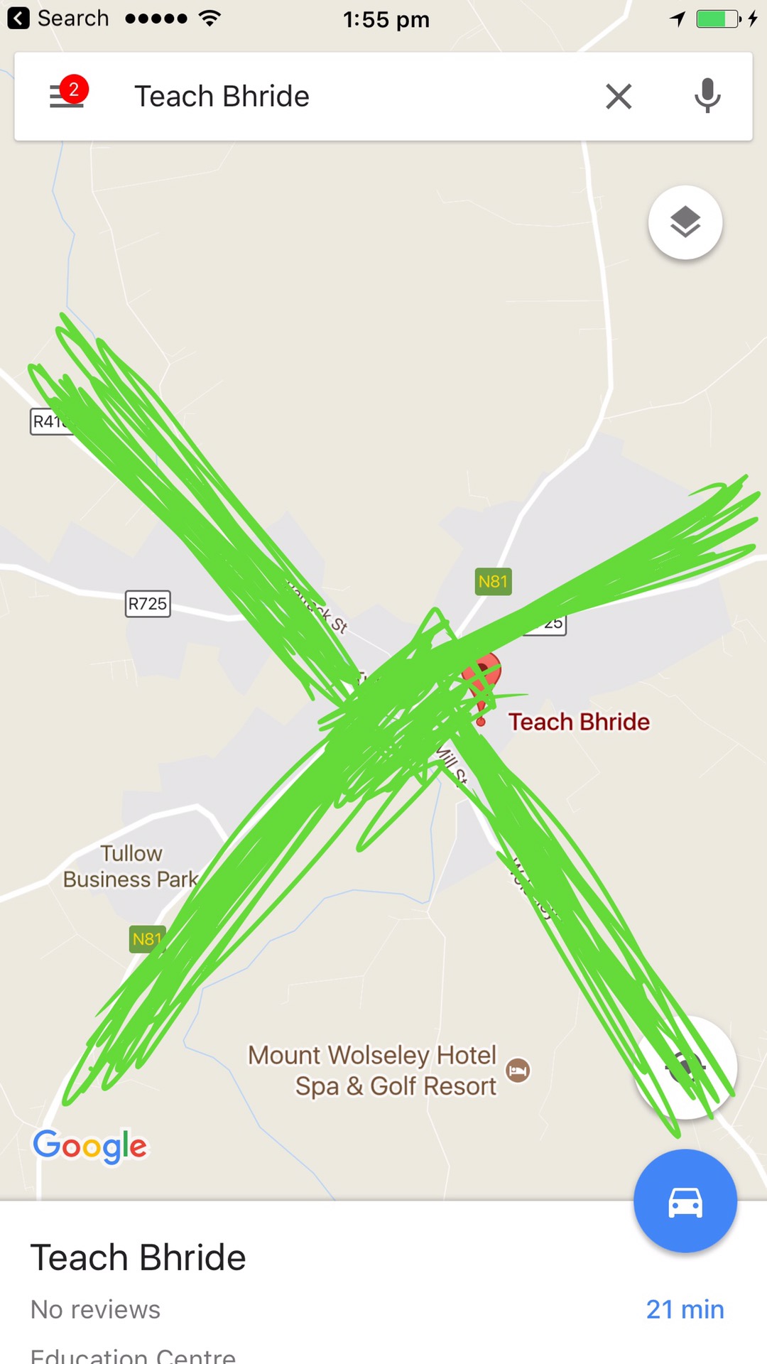 We continued on our journey and as we were coming into Tullow I looked at google maps to see how far away we were and this is what I saw: