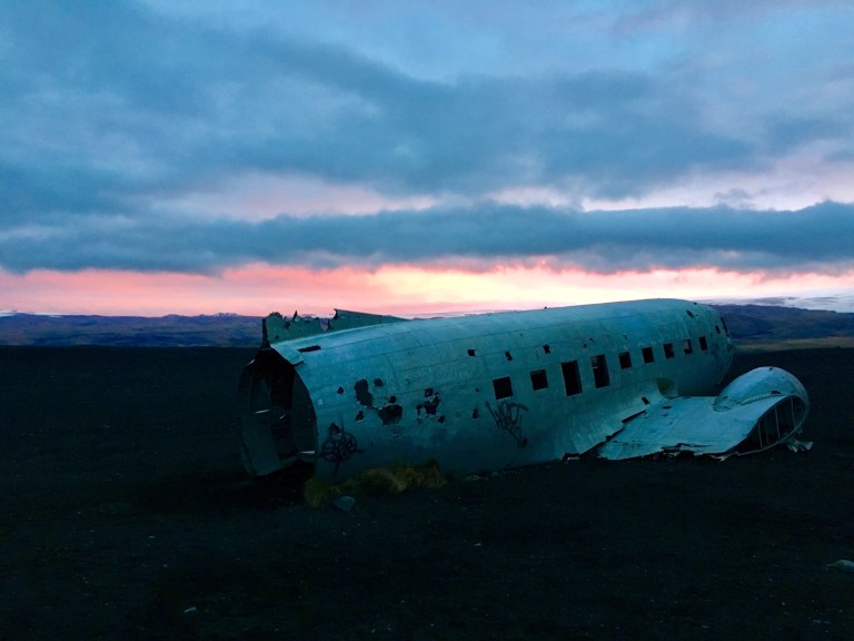 On 21 November, 1973 the United States Navy Douglas Dakota made a forced landing on a sandur in Vestur-Skaftafellssýsla and was abandoned. The crew survived, but the cause of the crash are somewhat unclear as accounts differ as to whether it was due to a mechanical failure, the plane running out of fuel, or a storm. The fuselage of the aircraft is what remains. The plane was one of four Douglas Dakotas based at the US Navy base in Keflavík, which was an important military base during the Cold War. The planes, which had previously served in the Korean and Vietnam wars, all met their ends in Iceland, as the three other planes were damaged during take-off. The base was closed in 2006 when the US Navy left.