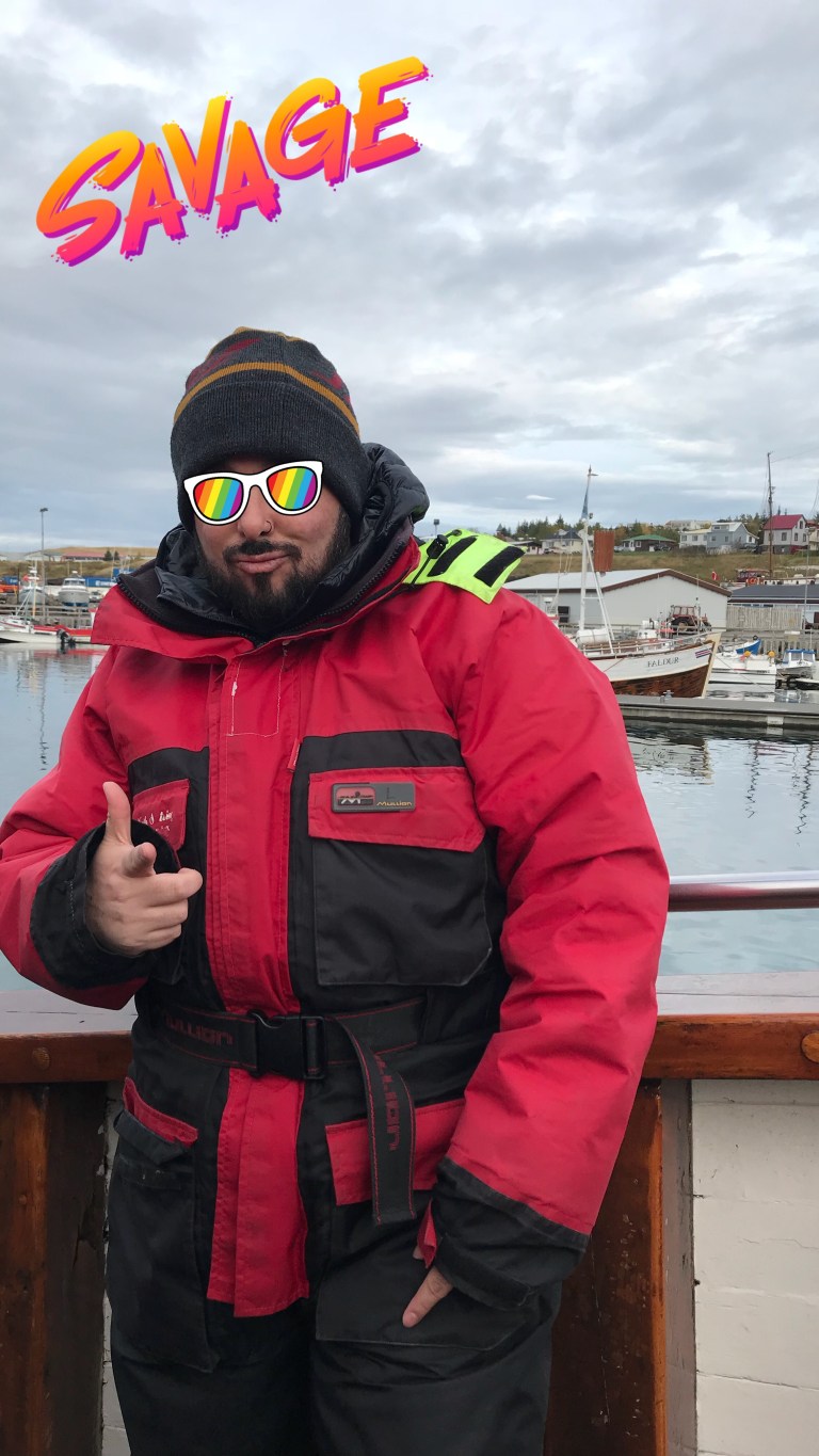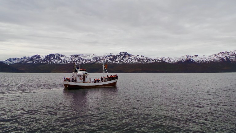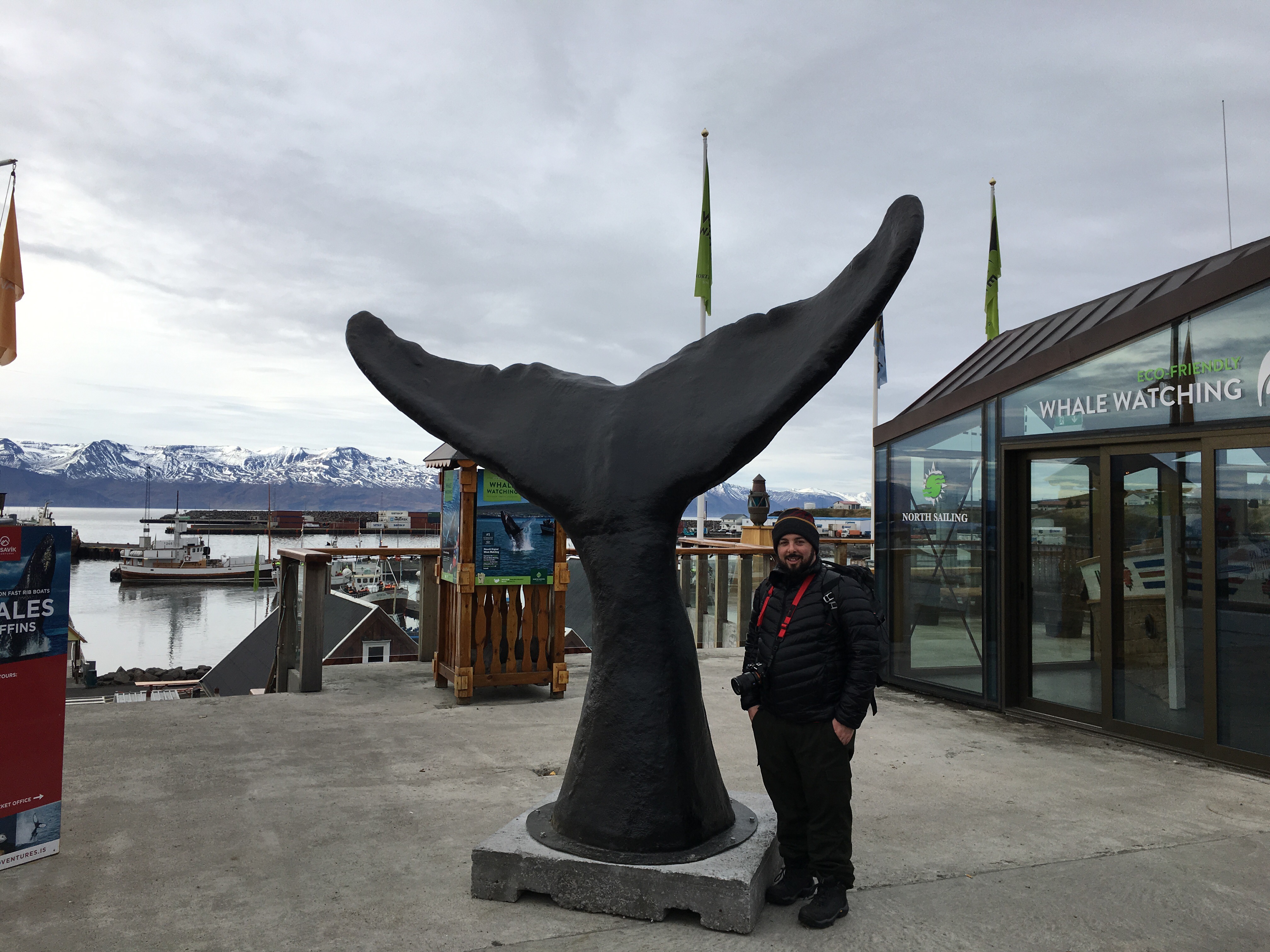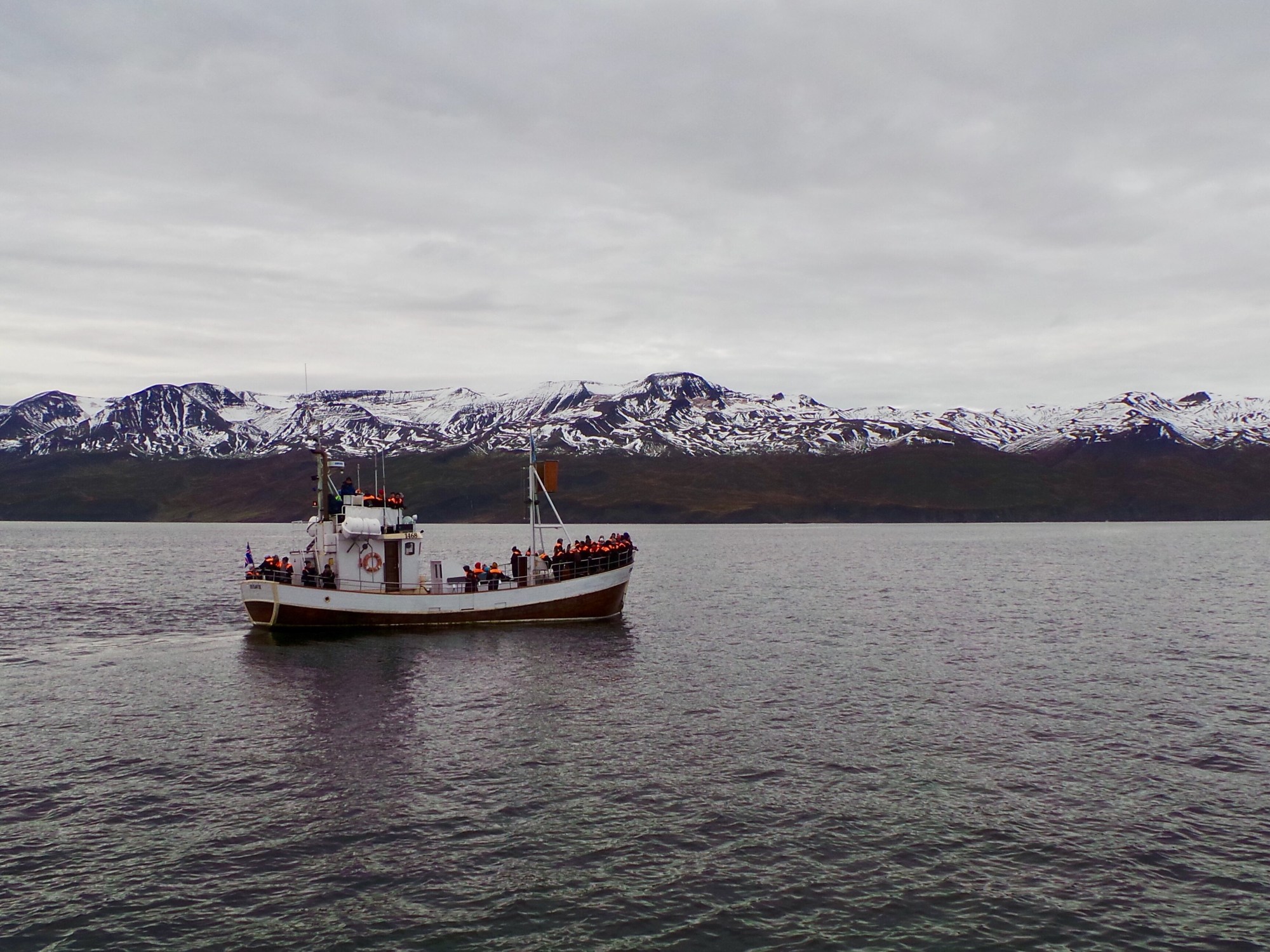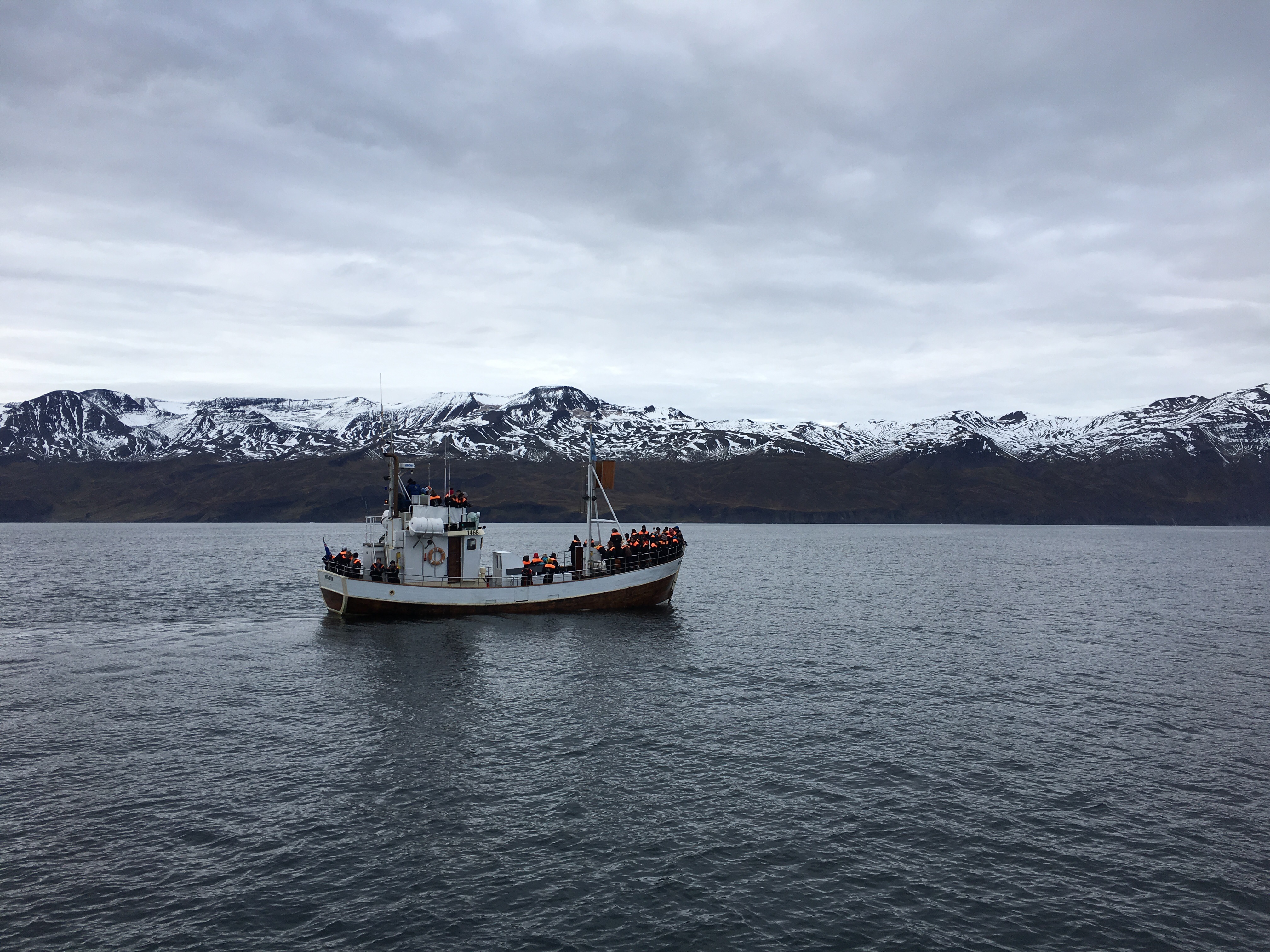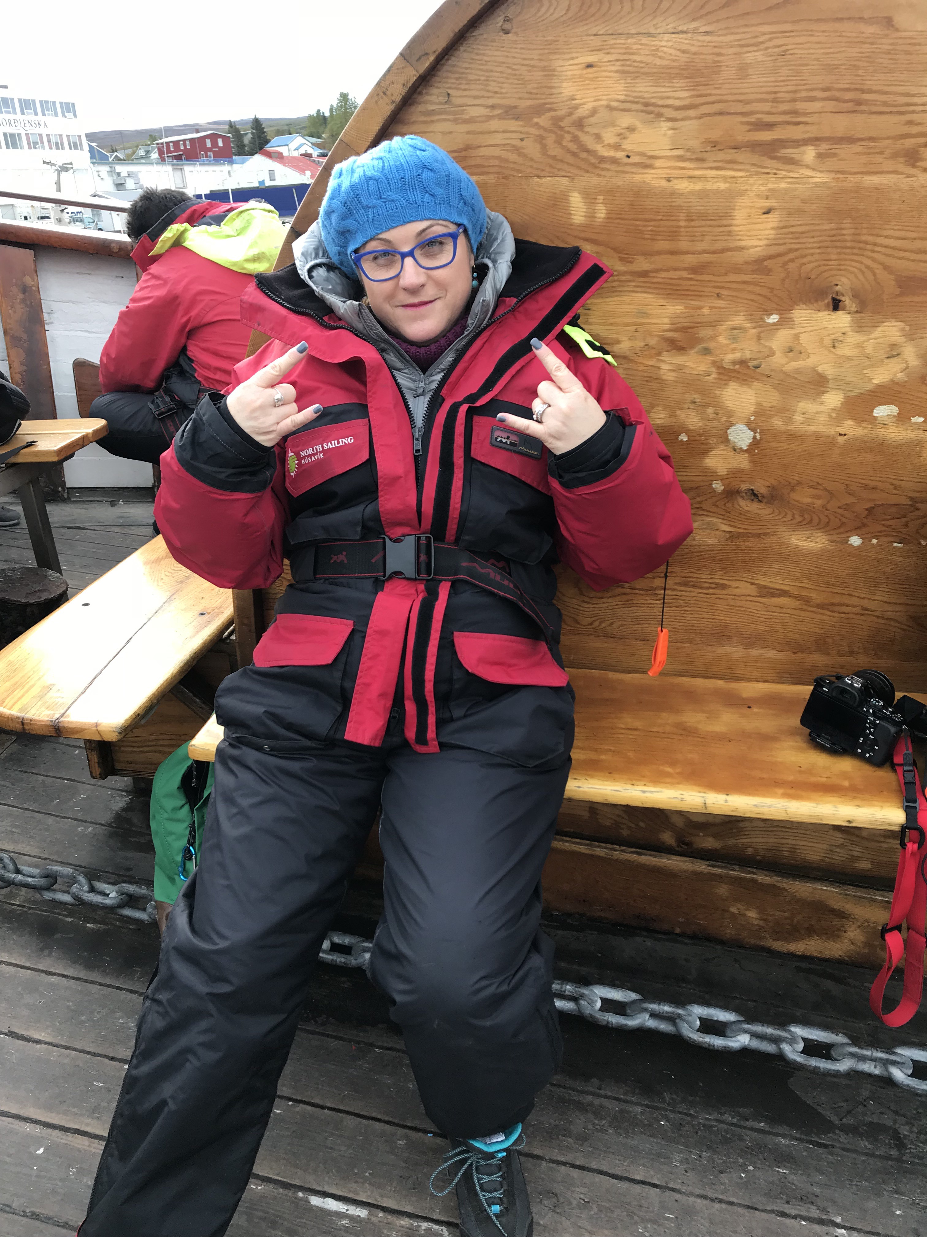 What an adventure! The boat used the age old method of whale spotting – head straight to where the other boats are. They don’t use sonar equipment or anything that can disturb the whales. We suited up in some warm floatation suits and headed toward the snow capped shore across the harbour.