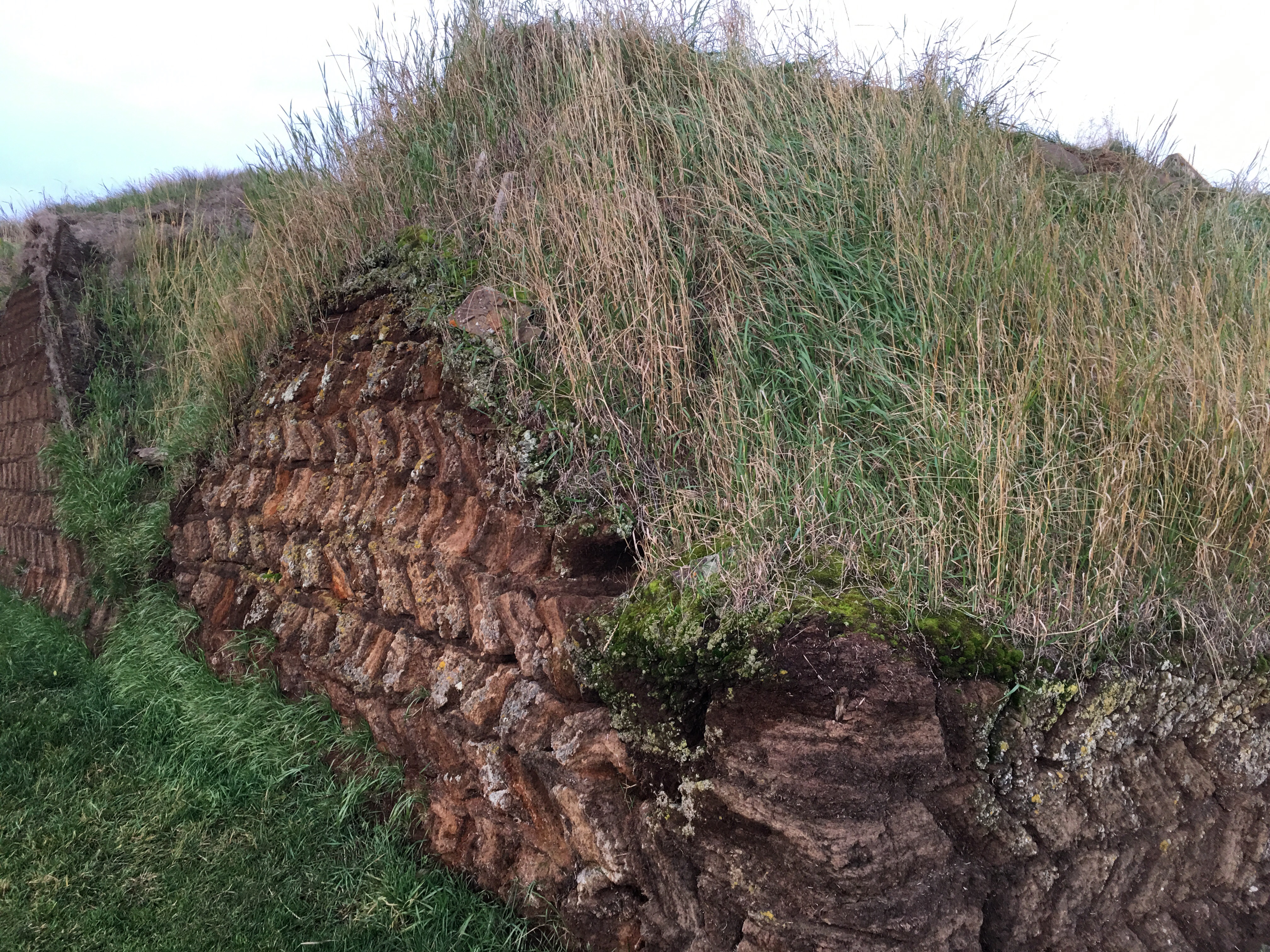 The farmhouse is built of turf, stones, and timber. The walls are built of stones and of pieces of turf layed up in a herringbone pattern, with long turf strips between the layers. The Glaumbær estate provided little rock suitable for building purposes, but it has plenty of good turf, so the walls of the farmhouse contain relatively little rock; it was used only at the base of the walls to prevent damp from rising up into them. Imported timber and driftwood were used in the interior frame and paneling.