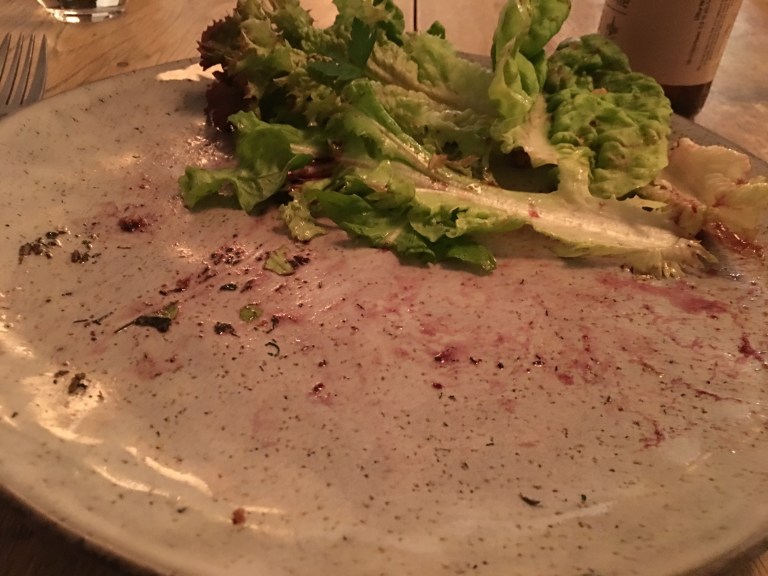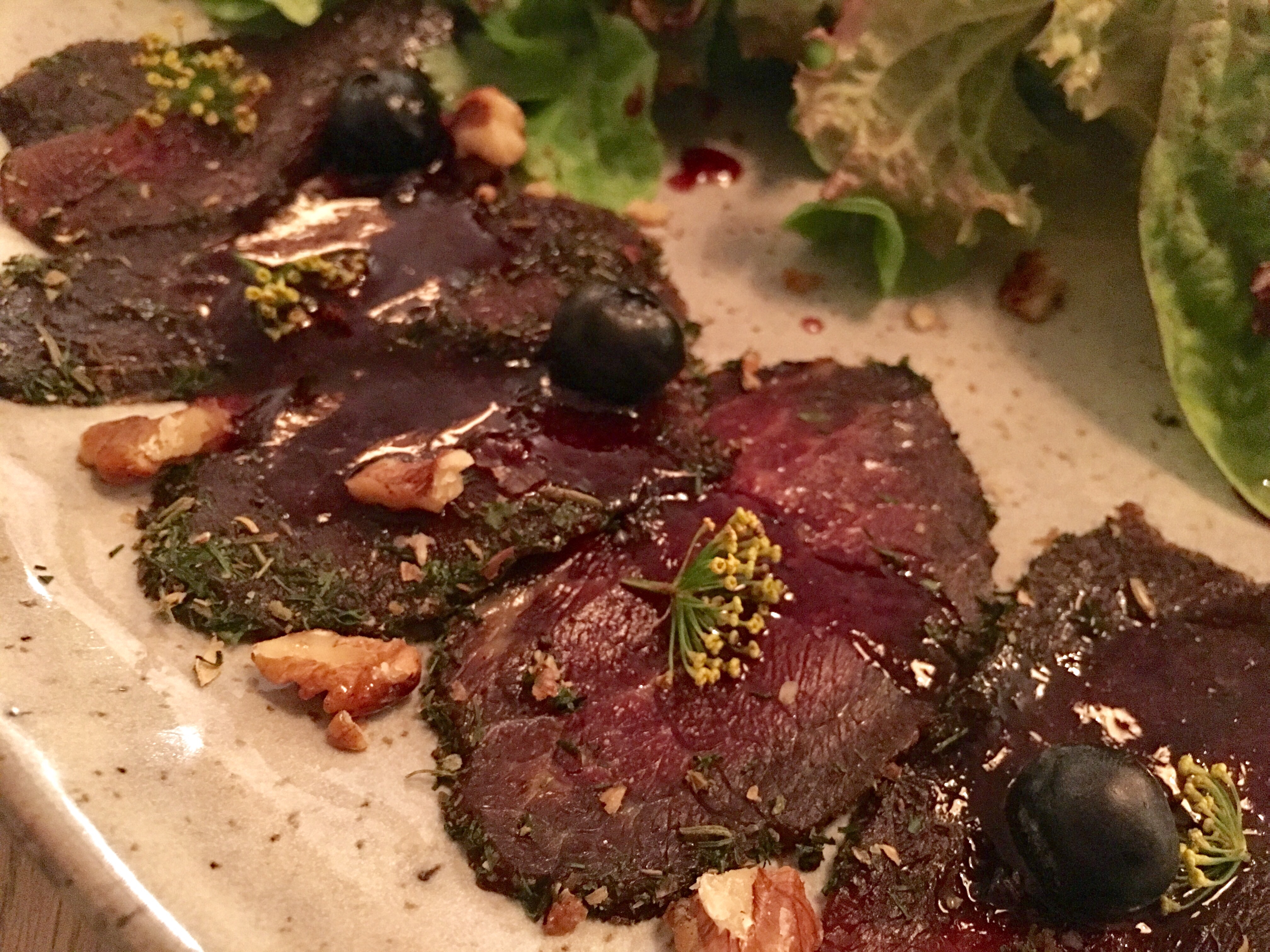 First course: cured horse with salad, strawberries and local foraged berry dressing.