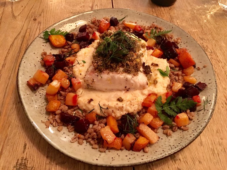 Second course: Ling topped with chervil, dill and dulse (seaweed) on celeriac purée served with cubed root vegetables: carrot swede beetroot , surrounded by organic Icelandic barley