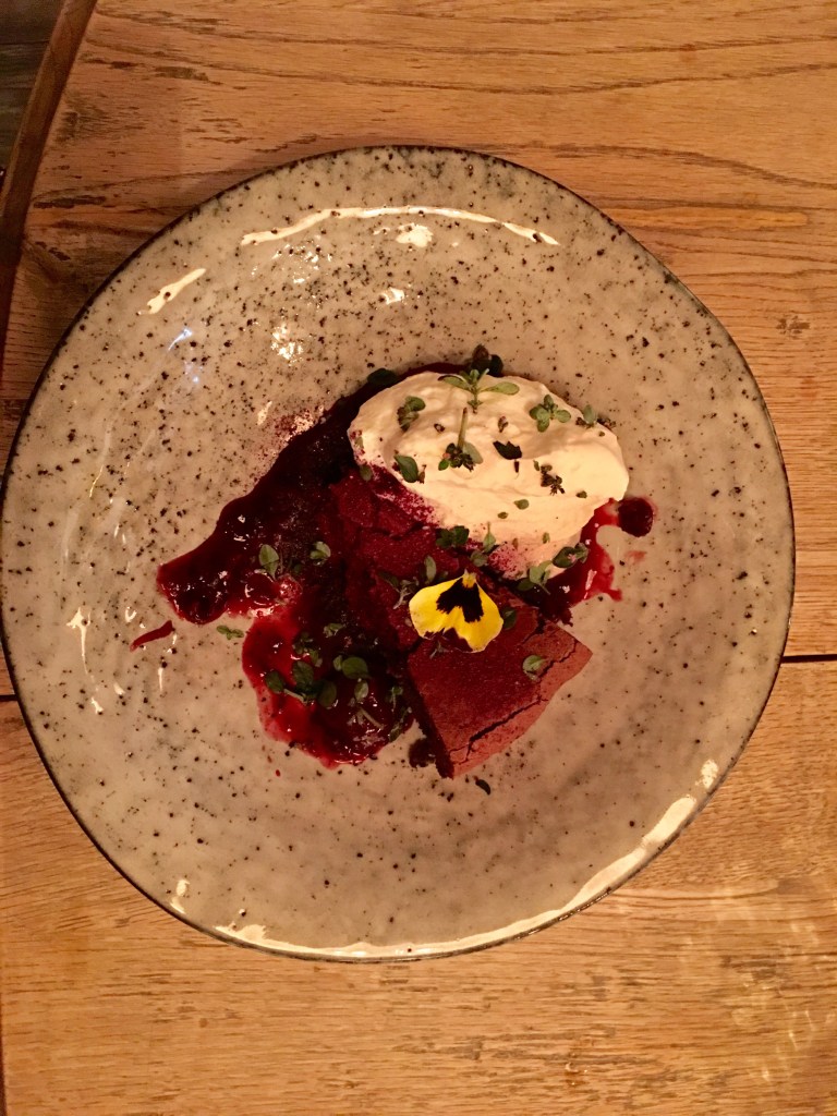Flourless Chocolate cake like the cracked surface of the earth dusted with blueberry powder; Skyr and cream for the glaciers – sprinkled with lemon thyme; Berry coulis – strawberries, red currants and black currants.