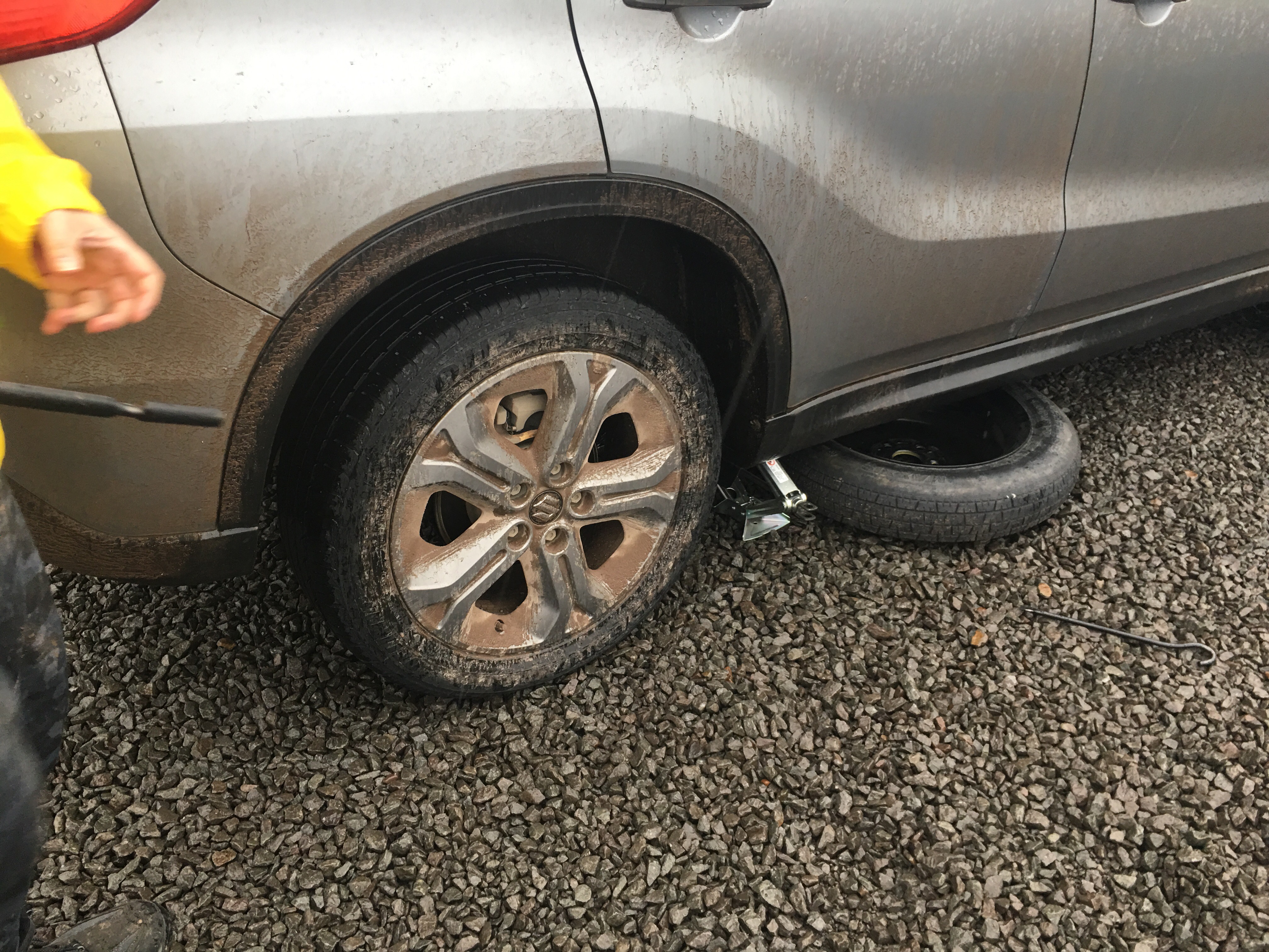 Josh struggled for an hour. Jacking up only to have the rocks move and it drop again. Lower and then jack up again only to have the wheel nuts so tight they would not budge. Even standing on the iron succeeded only in bending it.