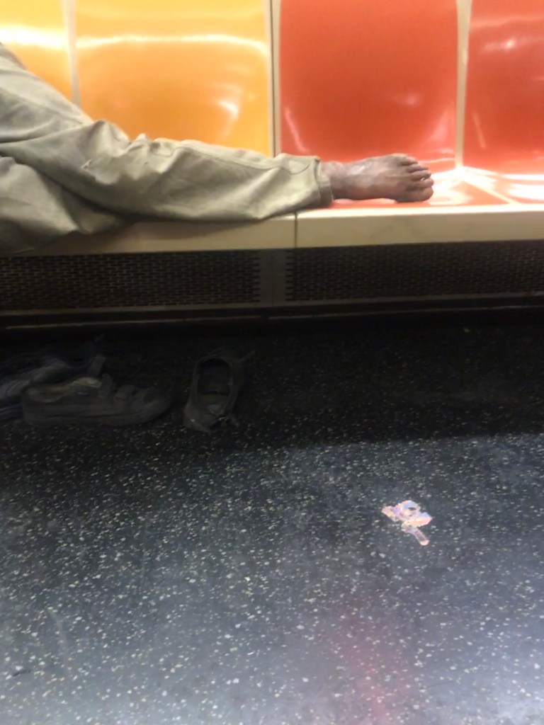 We got in our carriage on the train and there was a homeless man asleep across a whole line of seats. The ultimate mans leading. The staff woke him and he basically ignored them and asked us the time and what the next station was. He had no shoes on and there was one ripped pair under the seat alongside a new pair of Nikes. When he got off the train he put on the old ones and it was as if he didn’t see the new ones. I couldn’t work out whether or not someone had left them for him and he was unaware or if he just forgot them. I felt bad I didn’t call out and point them out to him. Even after he got off and people got on, no one sat where he had been. The empty seats and the lingering smell told the story.