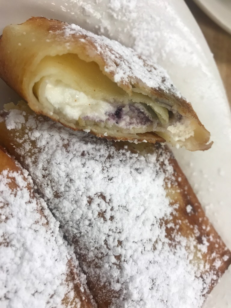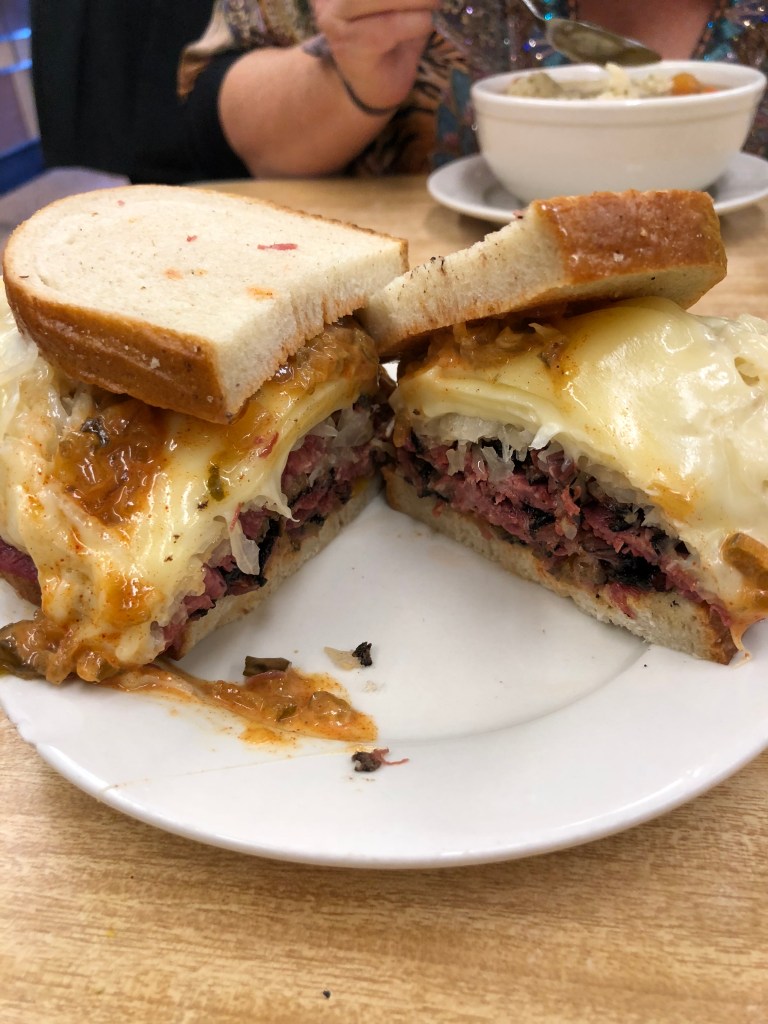 It all came together in the end. I shouldn’t have been surprised that the blintzes came in threes when one would have been plenty! If there’s one thing that is consistent about America, it’s super sizing. The blintzes were cheese and blueberry and served with sour cream and apple sauce. They were rather delicious and I managed to eat two. The matzo ball soup was something I’ve heard referenced to in TV shows and movies (The Nanny for one) and read about in books so I was looking forward to trying. I had no idea the balls were so big (that’s what she said) and I had no idea what they were made of. I decided I would just eat and enjoy and google to find out later. Turns out they are only unleavened bread. I was a little worried because there were things like tongue sandwiches on the menu.