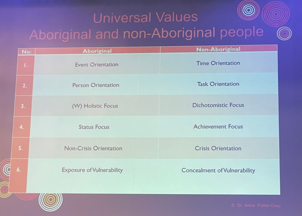 I think the big take away is being able to understand a culture that is practically opposite to mine so I can understand the ways my Indigenous students learn and be.