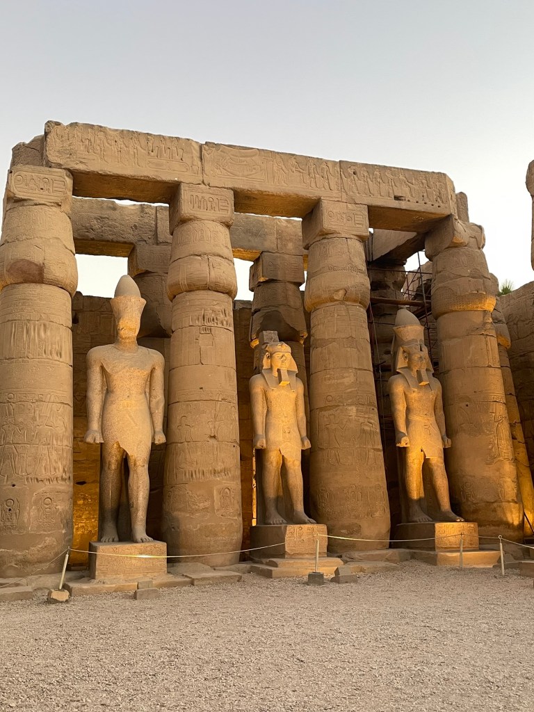 The colossal Ramses II statues guarding the entrance looked almost soft in the apricot light — which is not a sentence I ever expected to write about a man who plastered his name on every available surface.