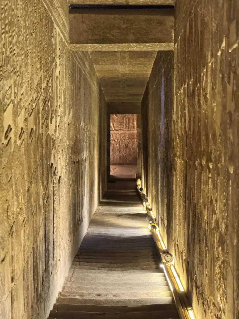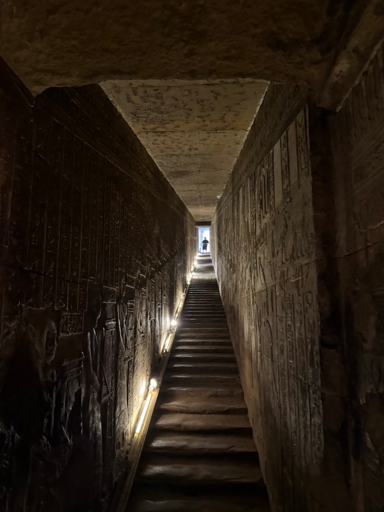 But the real adventure? The staircases. Egyptian temples never do stairs by halves. One spirals up and up, and the other spirals back down. Both lead to the rooftop chapels and the mummification room, where the cult statue of Hathor would have been ritually tended.