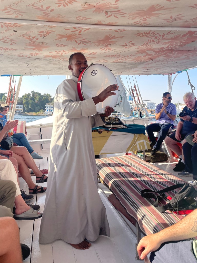 Meanwhile, our felucca sailor pulled out a drum, and suddenly we were in an impromptu Nile concert, clapping and singing along while drifting past palm trees. I recognized one of the songs as the work song from Raiders of the Lost Ark – the part where Indy’s team is digging in Tunis for the Ark.